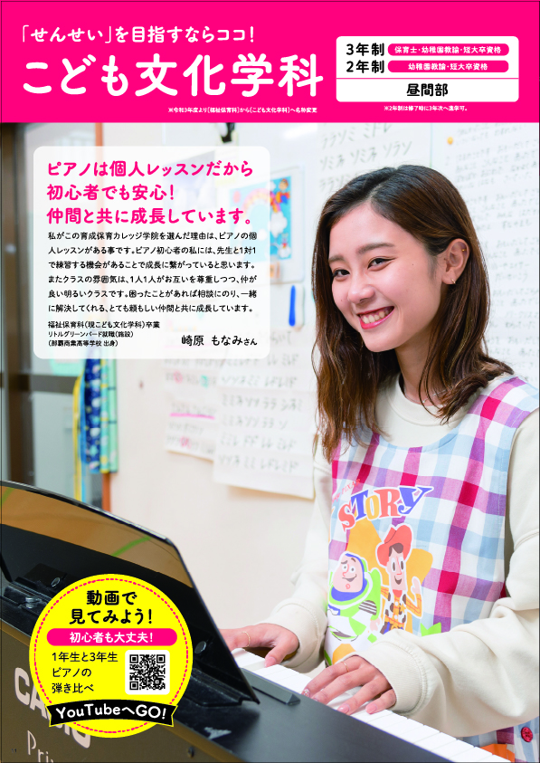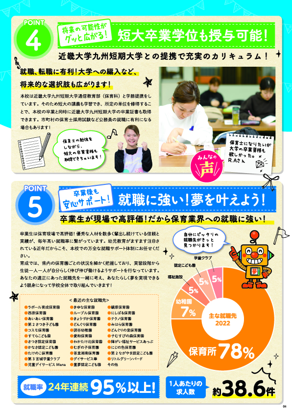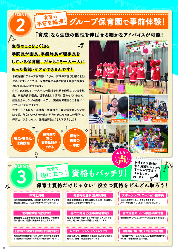 グループこども園である「ラポール育成こども園」がすぐ近くにあります。先輩の保育士や、かわいい子どもたちの姿を身近に見ながら学習できます。保育実習や就職など、あらゆる面で有利です。