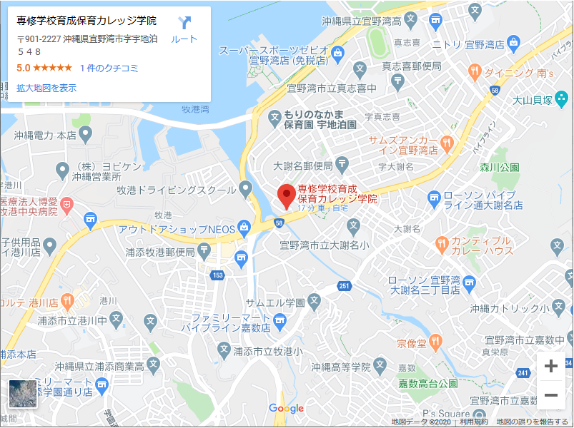 育成保育カレッジ学院は宜野湾市にあります。沖縄県の大動脈である国道58号線沿いにあり、バスや自動車で通学しやすい環境です。沖縄本島の南部からでも北部からでもアクセスするのに便利です。