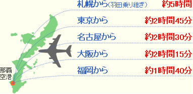 | 【タクシー・車】 | 那覇空港から国道58号線経由で約15Km。混雑状況によりますが車で約20~40分。 |