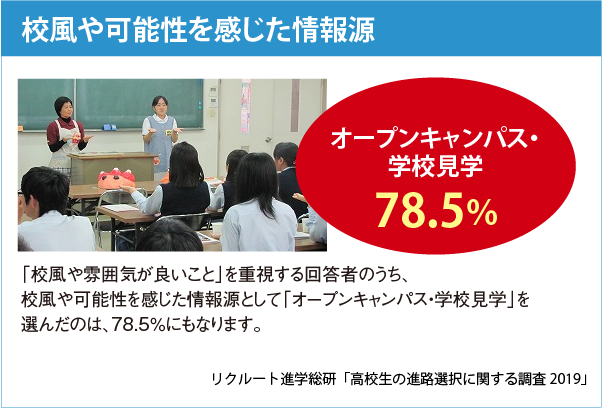全国調査によると、進路選択のために大学や専門学校などのオープンキャンパスに参加した高校1~2年生の率は、毎年増えていく傾向があります。