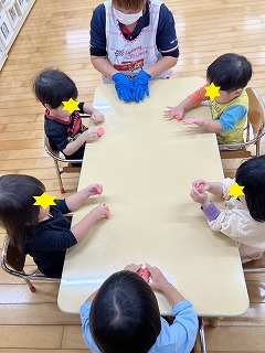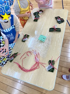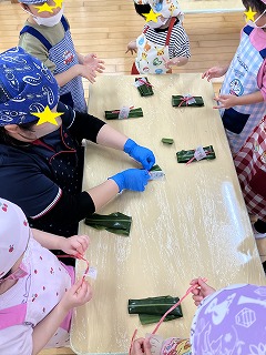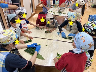 保育士と一緒に園児達が「カーサームーチー」作り、月桃(サンニン)の葉は、保護者の皆さんが提供して頂きました。それぞれの家族の健康と長寿を祈願!