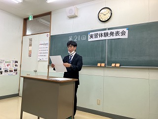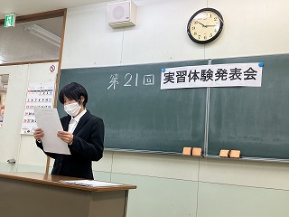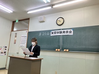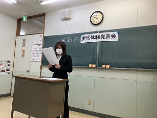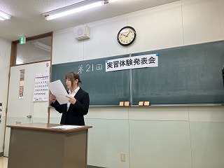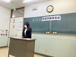昨年、実習(保育園・認定こども園・幼稚園・施設)を終えて振り返りの授業の一環。1人ひとりそれぞれの発表は内容が充実していた。実習を終えて発表する3年次の学生の表情は、はればれとして輝いていた。