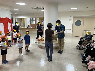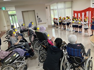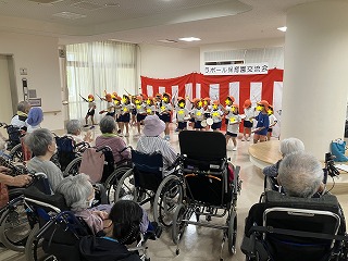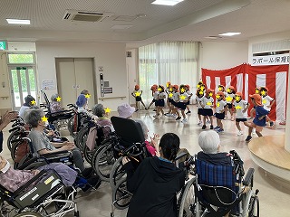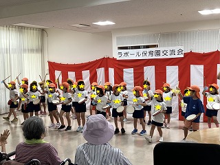 8/21(木)当グループの「ラポール育成こども園」の園児さんが、おじいちゃん・おばあちゃんの前でチビッコエイサー踊り又、歌を披露!!