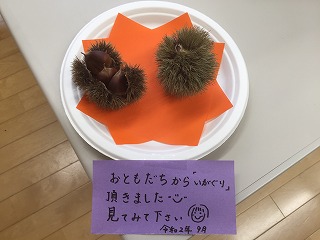 小さな秋を見つけました(^^♪ 2020年9月26日 スタッフ育成保育 カテゴリ: ラポールこども園ニュース, 新着情報 9/25(金)にそら組さんの保護者から、栗を頂きました。子供達や保育士も小さな秋を体験しました。有難うございました。