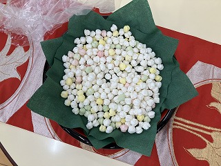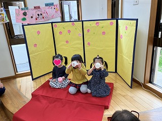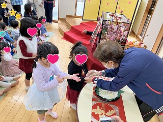 0才児から5才児の全園児がランチルームに集まり、1人ひとり女の子達に先生からカルピスジュースとあられを頂きました。