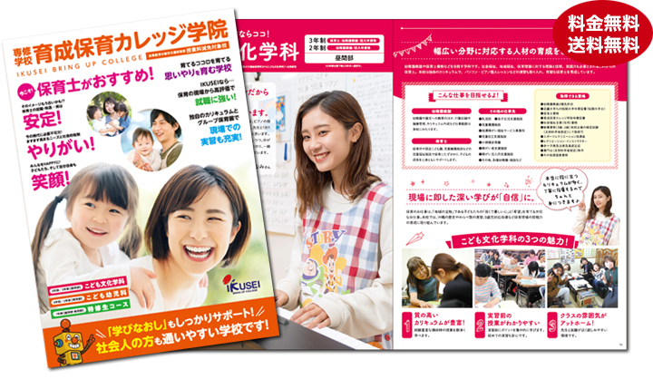 くわしいカリキュラムやスクールライフなど、育成保育カレッジ学院のすべてがわかるパンフレットをお送りします。学校の先輩たちによる体験談もたくさん掲載されています。入学願書や学費サポートについての書類も同封します。