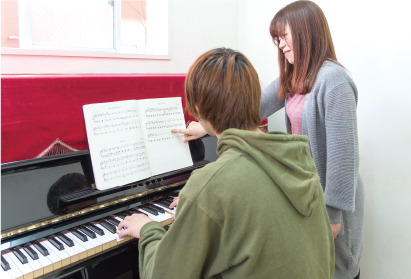 ピアノ専用室は校内3カ所。講師とじっくりマンツーマンで個人レッスンできて、譜面も読めるようになります。