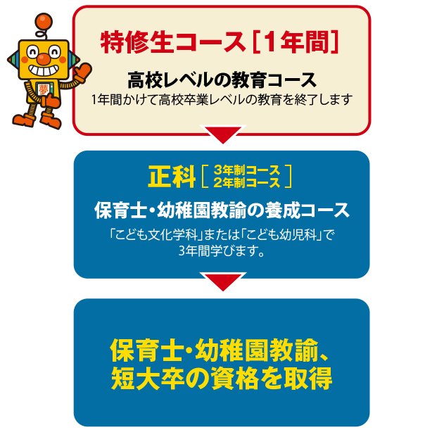 1年間かけて「特修生コース」で学び、高校レベルの教育を修了すれば、育成保育カレッジ学院の正科(こども文化学科またはこども幼児科)へ入学する資格を得られます。